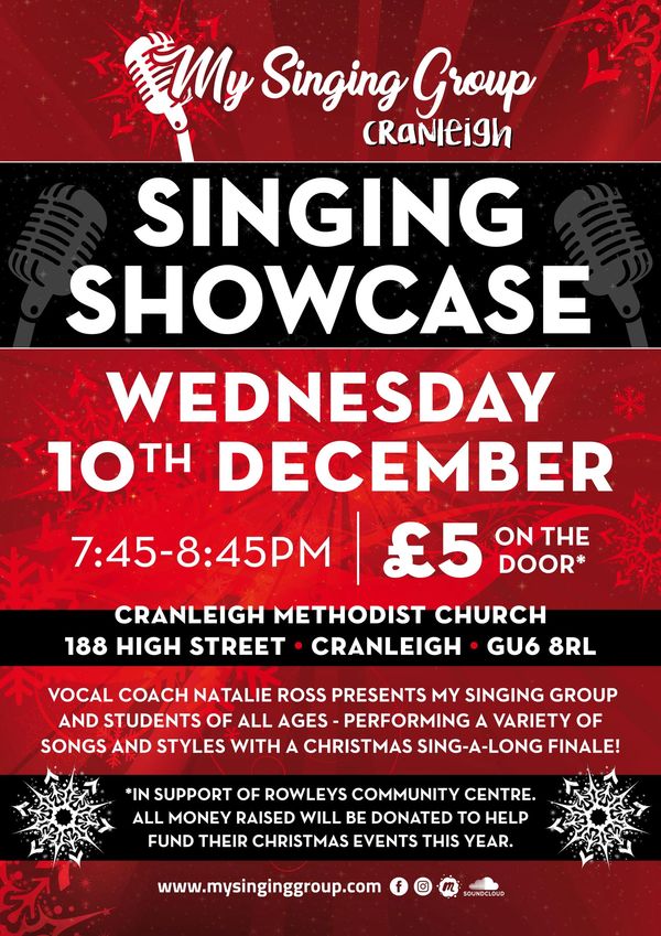 We invite you to a special Singing Showcase on Wednesday 10th December at Craneligh Methodist Church. It will include the choir and solo performances. Expect an eclectic mix of levels and styles and a Christmas sing-a-long at the end. The concert will raise money for Rowleys Community centre to help them fund their Christmas events this year.